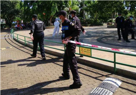 启动疫情预案后,警戒防控组控制现场,劝导入口的游客禁止入园,警戒线封锁该片区。