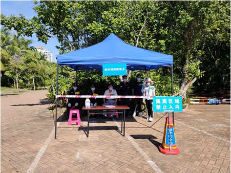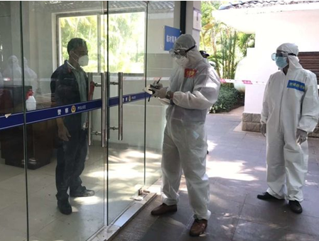 通信联络组上报美兰区防疫防控指挥部、海旅集团,并在路口等待引导疫情防控指挥部救护人员抵达警务室。